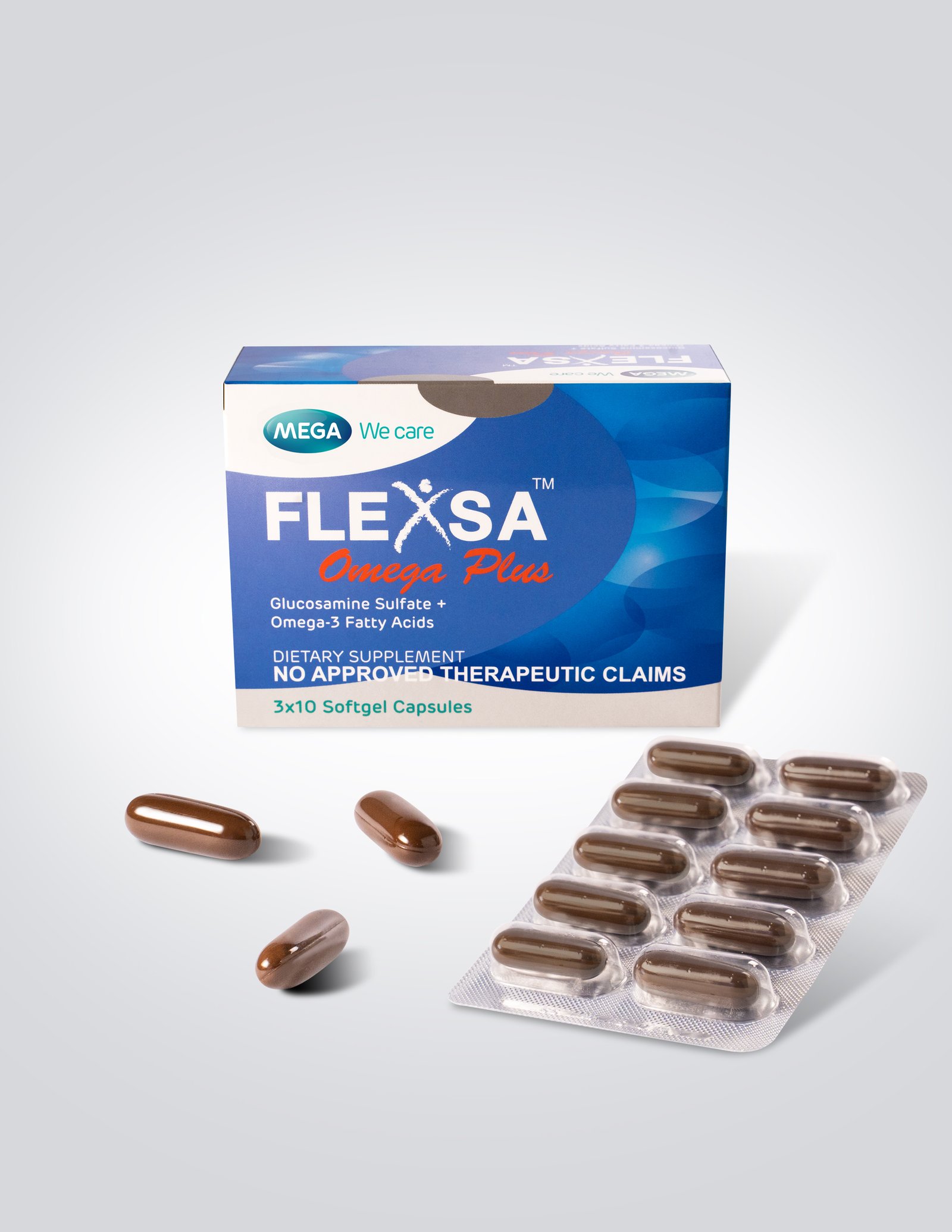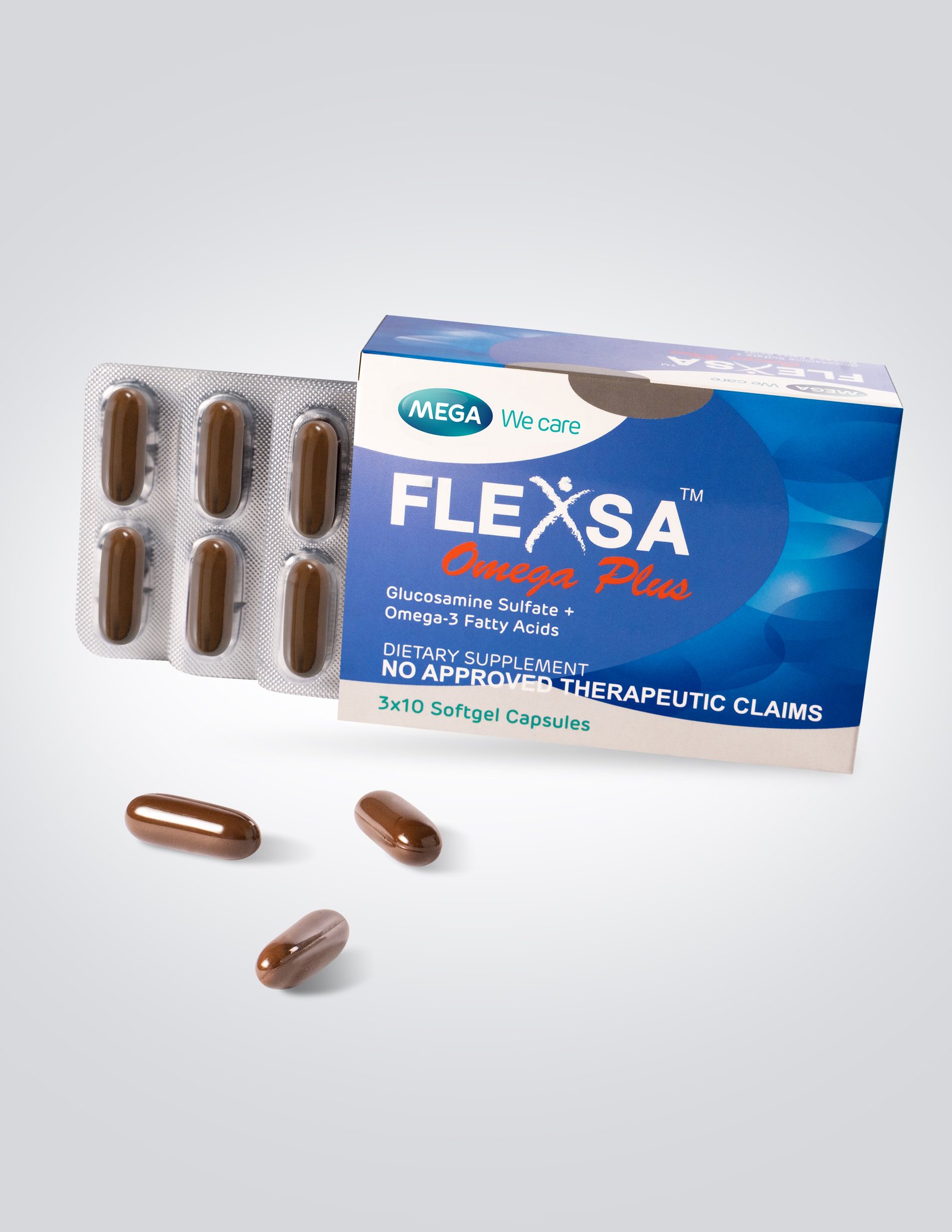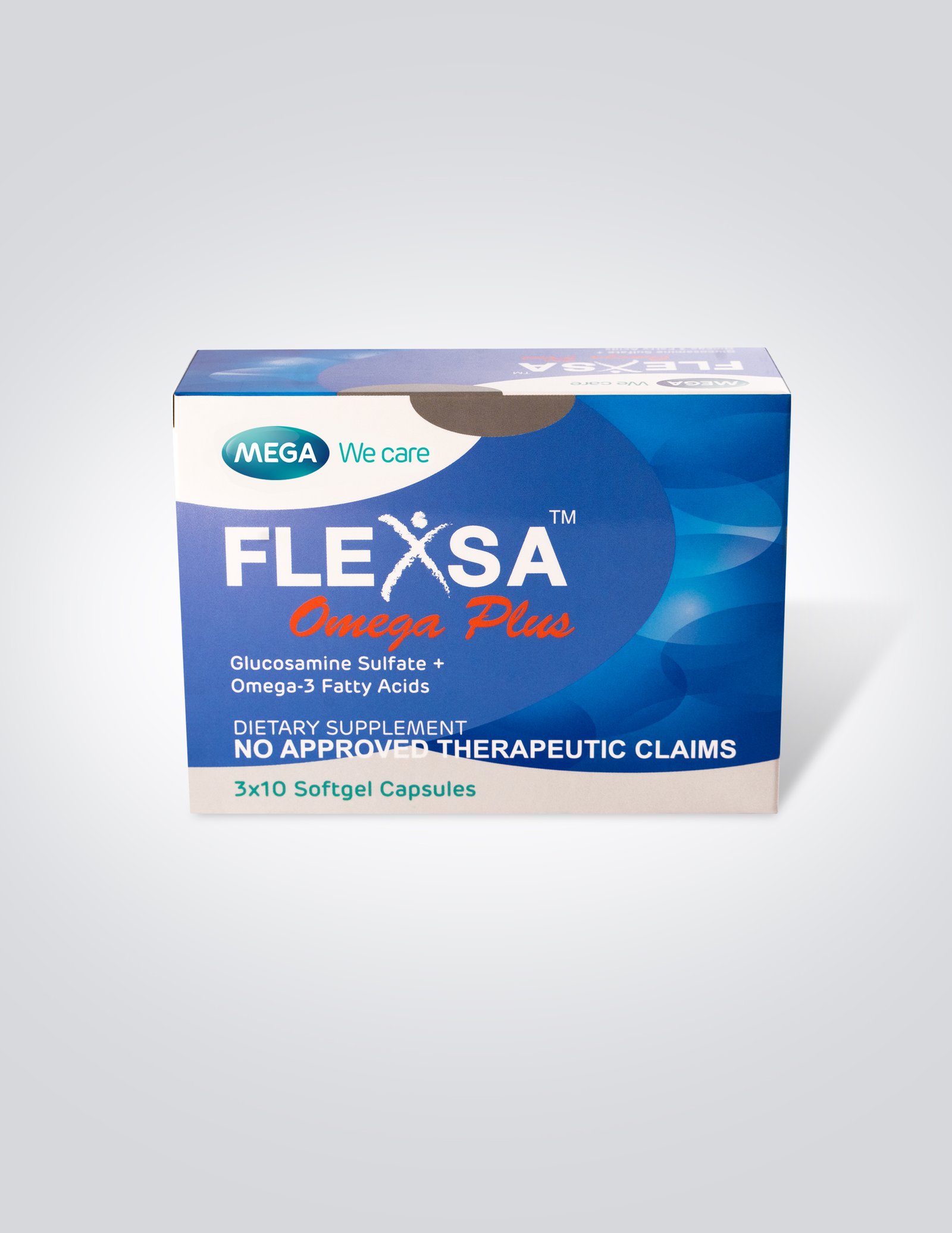 Flexsa Omega Plus is the only Glucosamine preparation with Omega-3 Fatty Acids that provide synergistic joint protection. Glucosamine helps to stop further damage in joints while Omega-3 Fatty Acids (in Fish Oil) helps reduce inflammation and pain.